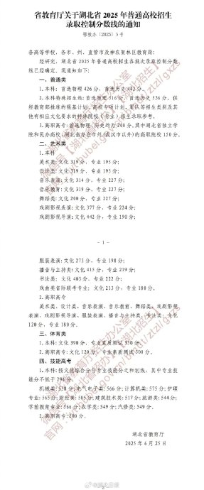 6月25日,湖北湖北省2025年普通高校招生各批次录取控制分数线出炉。本科